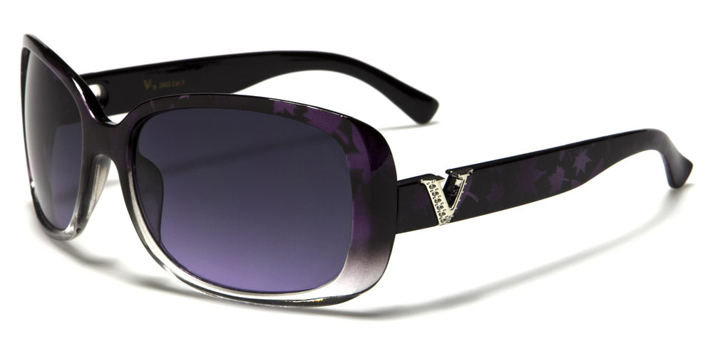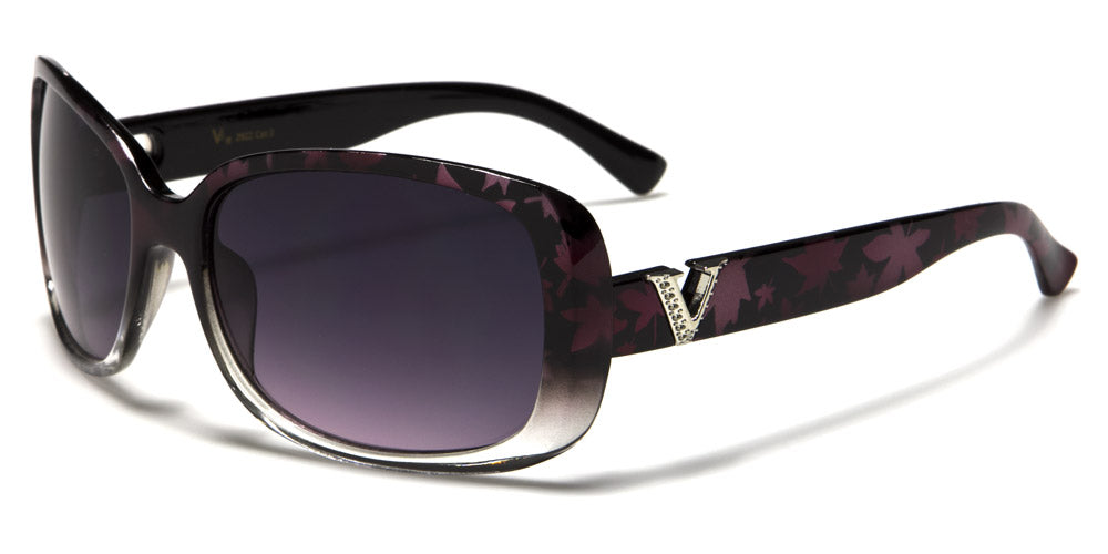 These women's VG sunglasses are made of lightweight plastic, which offers the ultimate comfort in today's modern-day sunglass designs. These sunglasses feature a simple, yet sophisticated rectangular shape that highlights a unique leaf pattern. Available at excellent wholesale prices, these celebrity-style sunglasses feature the silver "V" logo on the temple. This high-quality logo takes these sunglasses to an entirely new fashion level. Color options include black, gray and black leaf pattern, brown and black confetti pattern, brown and black leaf pattern, magenta and black leaf pattern, blue and black leaf pattern, and purple and black leaf pattern.