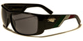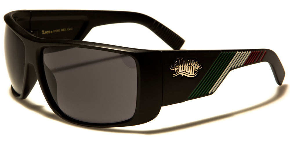 Large, squared-off oval lenses are encased in strong black plastic frames for plenty of eye protection on sunny days. Molded nose pieces grip the nose for stability. Very wide arms angle into narrower curved earpieces, and arms are decorated with raised green, white, and red stripes, the colors of the Mexican flag. Arms are also emblazoned with a metallic Locs logo. Your order will contain a selection of both shiny black and matte black color options available in this style. These sunglasses are sold wholesale by the dozen.