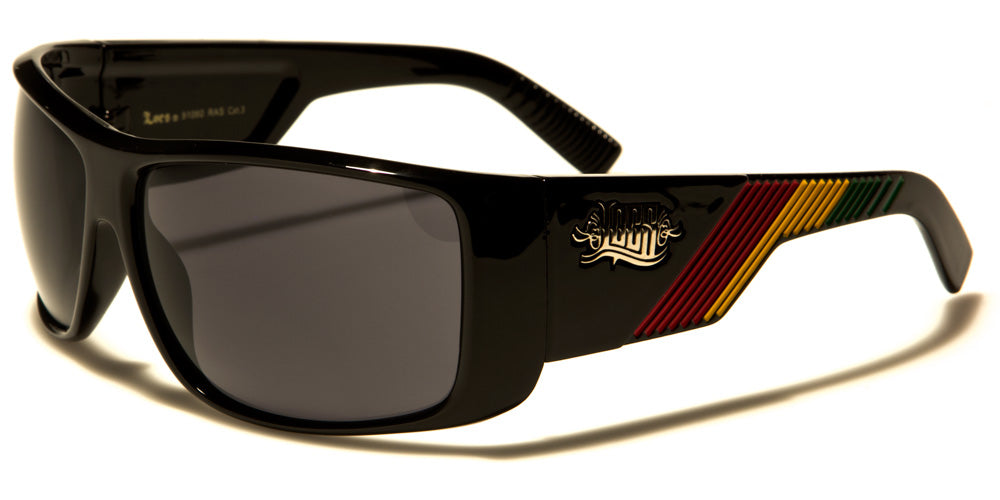 Large, squared-off oval lenses are encased in strong black plastic frames for plenty of eye protection on sunny days. Molded nose pieces grip the nose for stability. Very wide arms angle into narrower curved earpieces, and arms are decorated with raised red, yellow, and green stripes, the colors of the Jamaican flag. Arms are also emblazoned with a metallic Locs logo. Your order will contain a selection of both shiny black and matte black color options available in this style. These sunglasses are sold in bulk by the dozen.