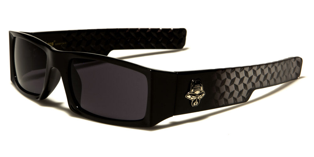 Look fashionably tough, but sleek and stylish, with these polished black Locs men's rectangular sunglasses. These sunglasses feature badass rectangular UV400 smokey gray lenses, a pair of molded nosepieces and extra-thick temples with a metal logo that taper off into almost straight earpieces. The arms also feature gray and black diamond-shaped pattern for an extra touch of style. These sunglasses are made of high-quality lightweight plastic. Check out the latest of our Locs and other wholesale sunglasses.