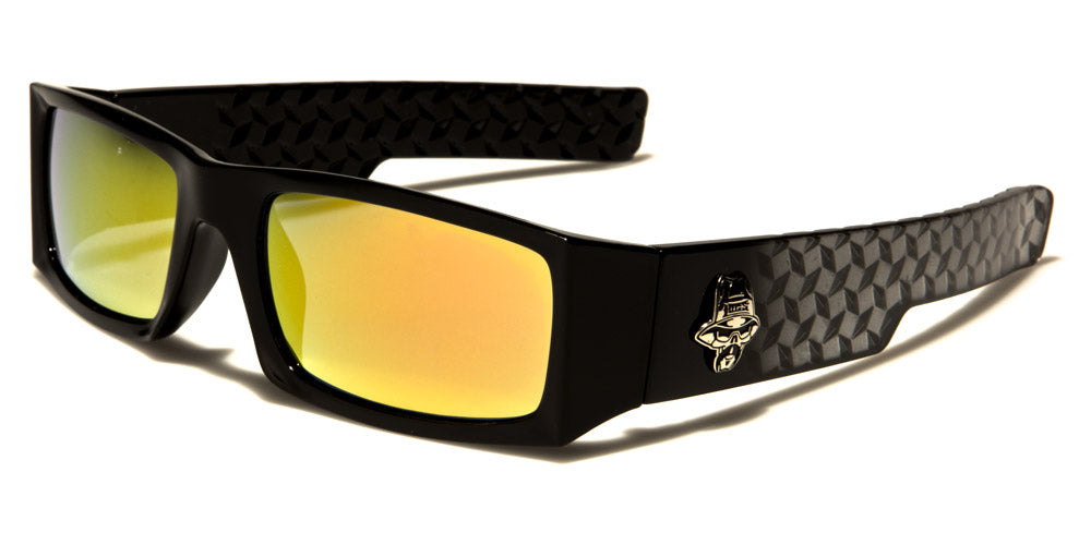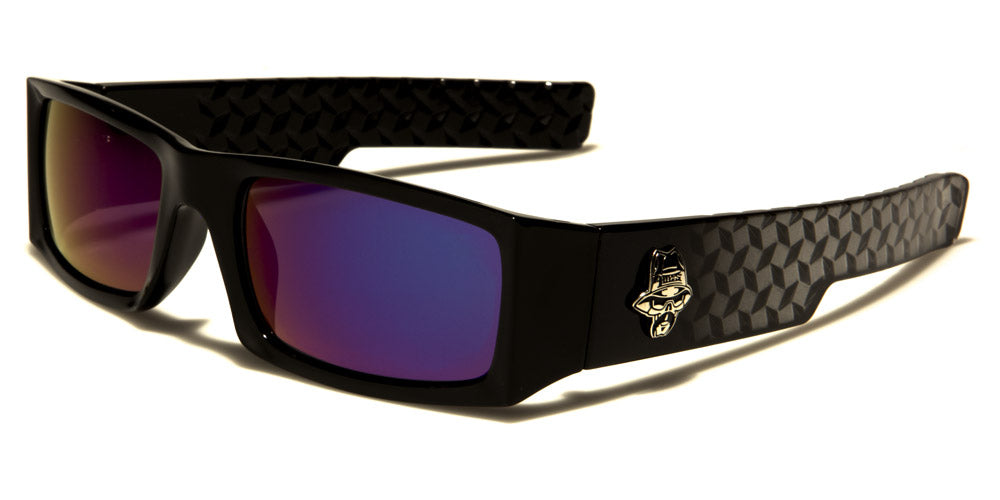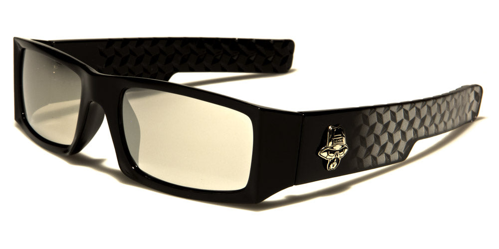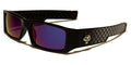 Trendy and bold - that's the look these Locs sunglasses provide. Get that cool rapper or stylish bad-boy vibe with the rectangular frames and mirrored lenses, chunky temple pieces, distinctive Locs logo and etched diamond-pattern designs. These are made of high-quality plastic in black with gray, and the lenses come in silver mirror, revo orange, purple and blue. In addition to the UV400 protection, the mirrored lenses feature a reflective optical coating for added visual clarity and comfort.