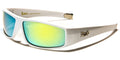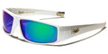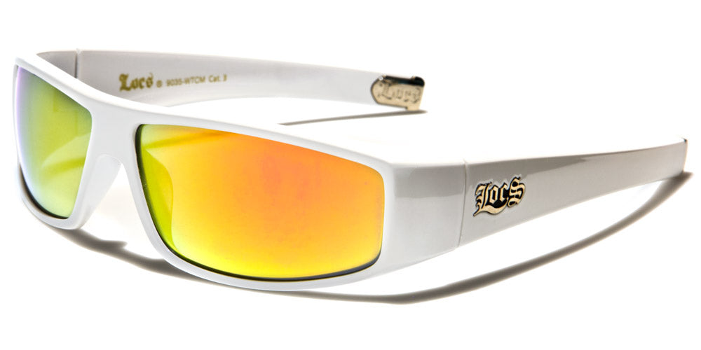 These flat-top Locs rectangular sunglasses for men are made of plastic and feature mirrored lenses for maximum protection from the sun's harmful rays. Color options include white frame with revo orange lenses, white frame with revo yellow lenses, white frame with revo green lenses and white frame with revo blue lenses. These sunglasses are adorned on the arms with a popular Locs logo and feature molded nosepieces and earpieces. The glasses are sold in bulk.