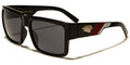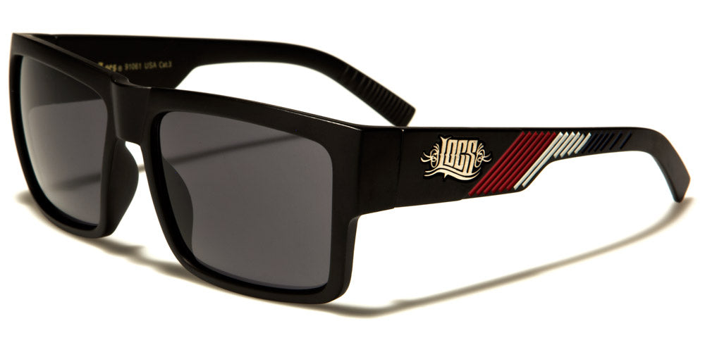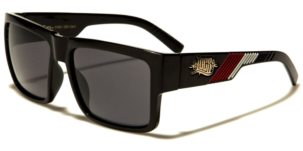 These bold shades flatter most face shapes, especially round or oval. Square lenses are encased in black plastic frames. Wide arms angle abruptly into narrower, curved earpieces. Arms are accented with either a metallic gold LOCS logo or a metallic silver LOCS logo as well as a set of diagonal ribs highlighted in red, white, and black. Dark lenses offer UV400 protection for comfort on even the brightest of days. These sunglasses are sold wholesale by the dozen.