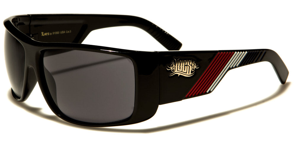 Show pride for your country with these adventurous sporting sunglasses. Plastic frames enclose black oval lenses to hug the head and create stability during physical activity. Very wide arms narrow sharply into slender curved earpieces. Arms are accented with a metallic Locs logo and 18 diagonally carved stripes in red, white, and blue. Choose from shiny black frames and arms or matte black frames and arms. These sunglasses are sold wholesale by the dozen.