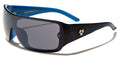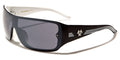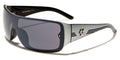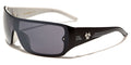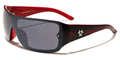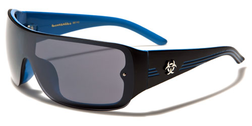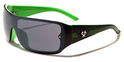 Biohazard has designed a sweet pair of men's shades that push the boundaries of style and will made you look as hip as you feel when wearing them. The frame is made of plastic, solid and strong, but lightweight and molded to fit comfortably and easily. The arms start thick and taper down to the curved ear with three racing stripes all along. The Biohazard logo is seen on the side in raised silver. The lenses are in the shield style and attached to the frame with rivets.