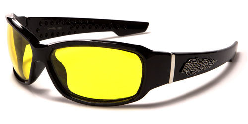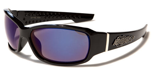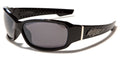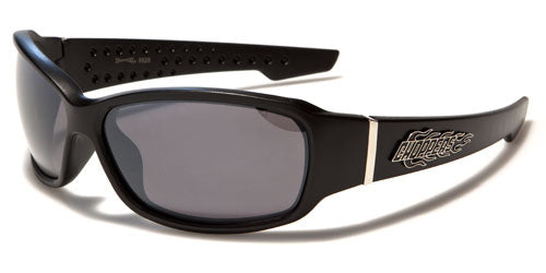 Choppers makes sunglasses for riders and bikers, and these cool shades form men are the epitome of what you want to wear on the open road. The frame is solid and strong plastic, shaped to fit comfortably and made to be lightweight, but also tough and rigid. The arms are thick and sport the Choppers logo and flames on the side next to a silver vertical divider. The lenses are rounded rectangles with a dark finish that protects your eyes from wind, dust and sun.