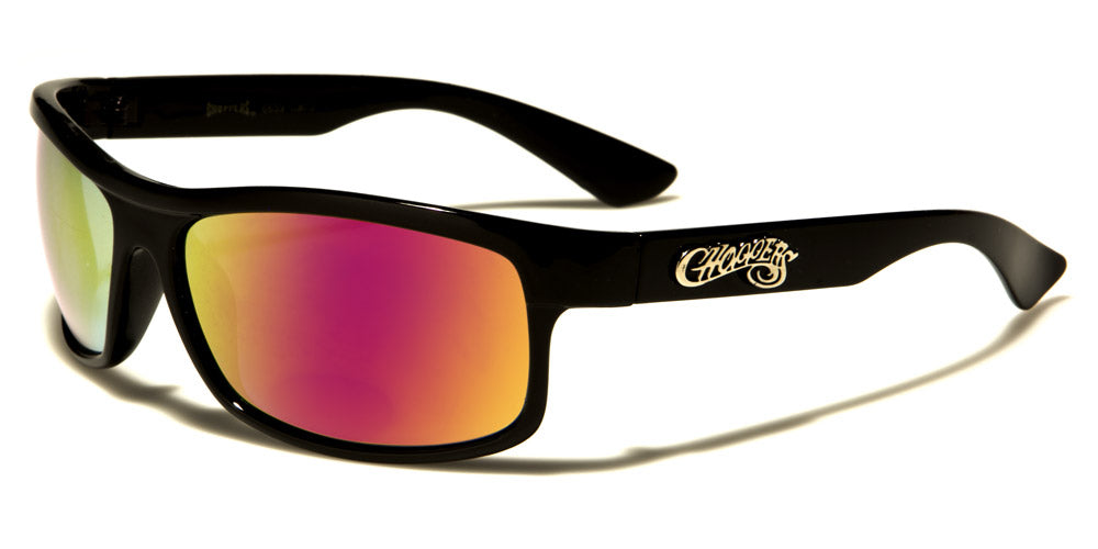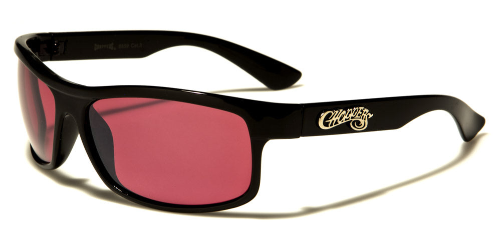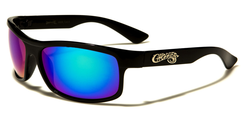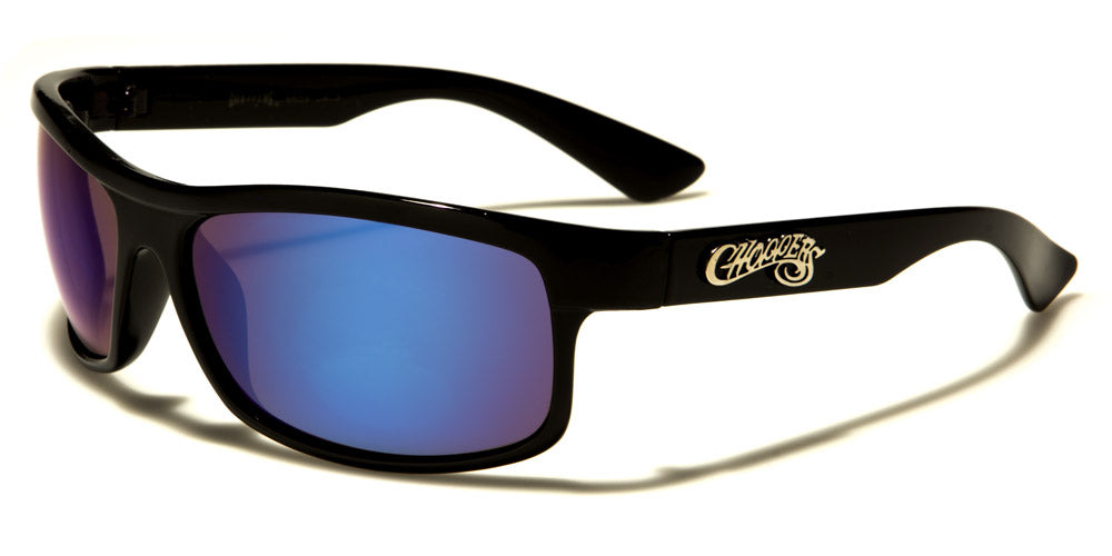 Choppers designed these cool shades for men to be sleek and attractive, but with enough strength to keep your eyes safe while on the road. The frame is made of solid plastic, meant for durability and comfort. The arms are straight with a notched curve at the ear and flair at the end for better fit. The Choppers logo is displayed proudly on the side in raised silver letters. The lenses are rectangular in shape and are dark, available in several different colors and finishes.