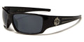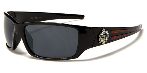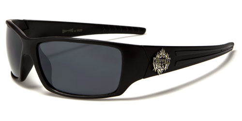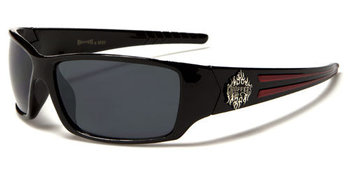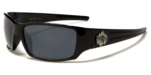 Choppers brand makes sunglasses for tough guys who ride, and these tough sunglasses are just what you're looking for. The frame is made of plastic, thick and durable with a shape that fits your head and stays on no matter the weather. The arms start thick and taper to the ear with a dual texture section. The Choppers logo is proudly displayed on the side in silver flames. The lenses are dark rectangles with a smoke finish that blocks ultraviolet rays and protects your eyes.