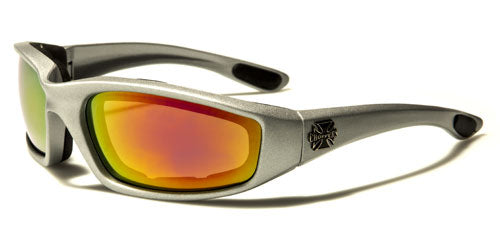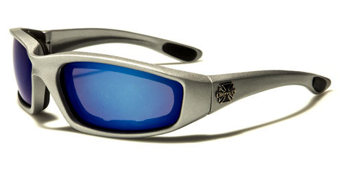 Cool as ice, with a hit of fire at the lenses. These Choppers wholesale sunglasses for men have thick silver frames and arms and mimic goggles you may wear while on the road on your motorcycle. These feature rectangular lenses, snug black foam liners on the insides and gently curved temples. The cross insignia with the Choppers brand name is emblazoned on either side of the sunglasses, at the temples. The sunglasses also have oval-shaped rubberized liners on the inside and the outside of the temple tips. The rectangular lenses come in silver, revo orange and revo blue. These are made of lightweight plastic for a more comfortable fit while you are on the go.