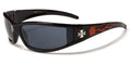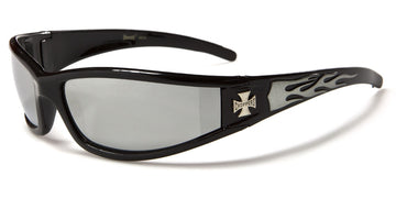 Check out the cool flames all along the sides of these nice shades by Choppers. Made for men who like to ride and want to keep their eyes safe and protected while on the road, the lenses on these sunglasses have an either smoke or a mirror finish and actually bend around the side for additional protection. The frame is made of plastic, tough and durable and able to stand up to dangers encountered on the road. The arms come straight off the face and taper to the ear.