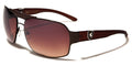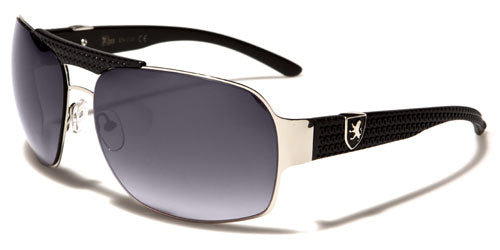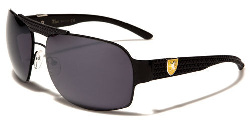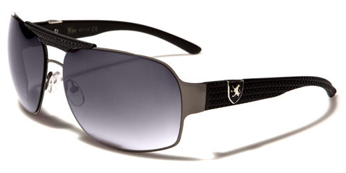 With a textured set of arms and front cross piece, these sunglasses for men by Khan are cool to look at and to touch. The shades are both plastic and metal, flexing where needed, but rigid and able to hold their shape and fit comfortably. The arms are straight with an inward curve at the ear, and they feature a Khan logo on the sides. The lenses are large and dark in a rounded rectangle shape. They will protect your eyes from the sun and other debris.