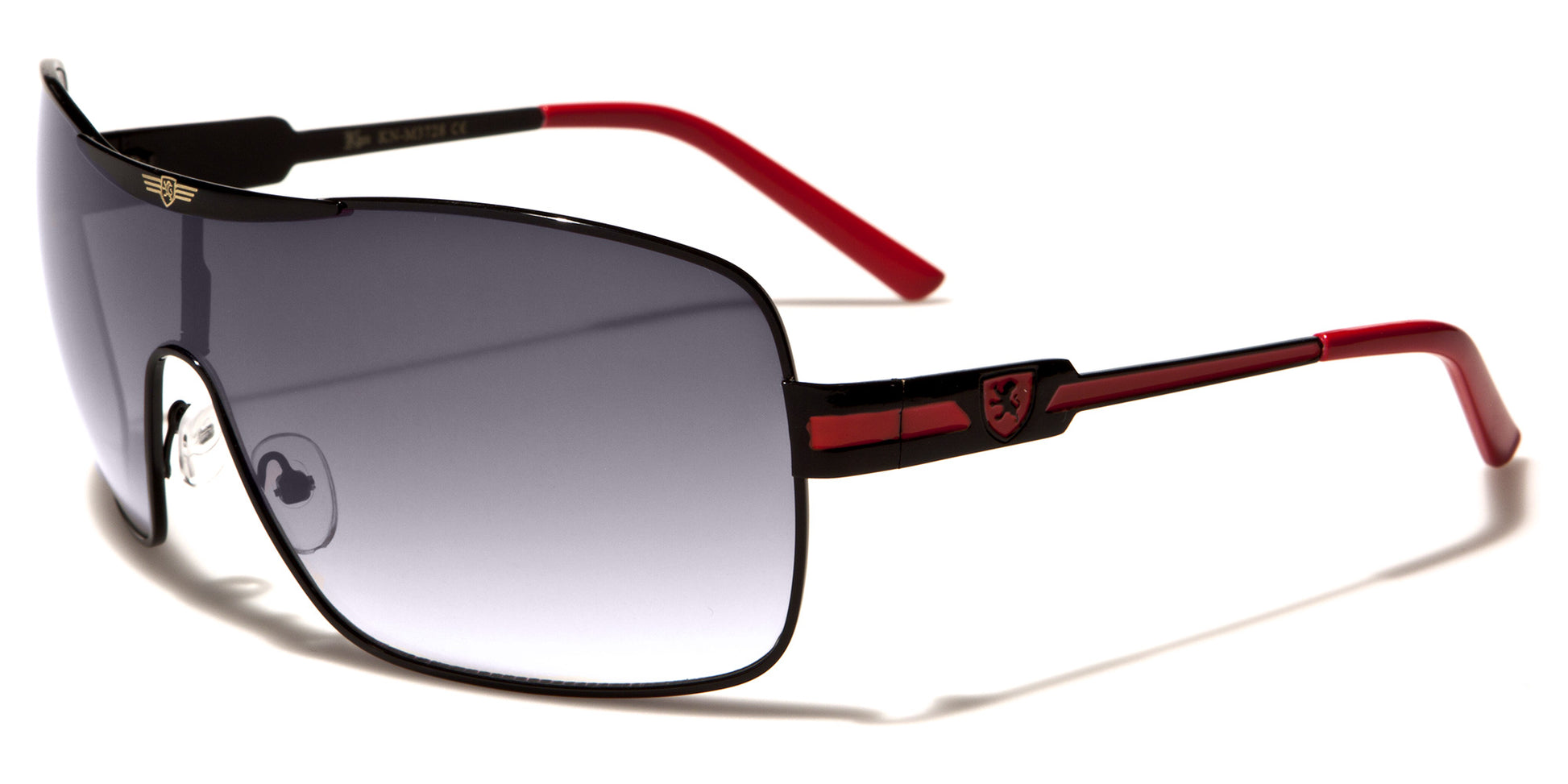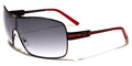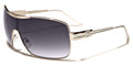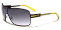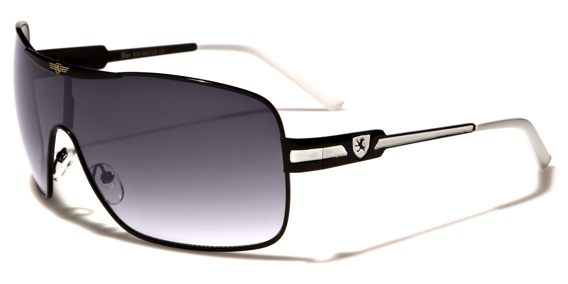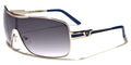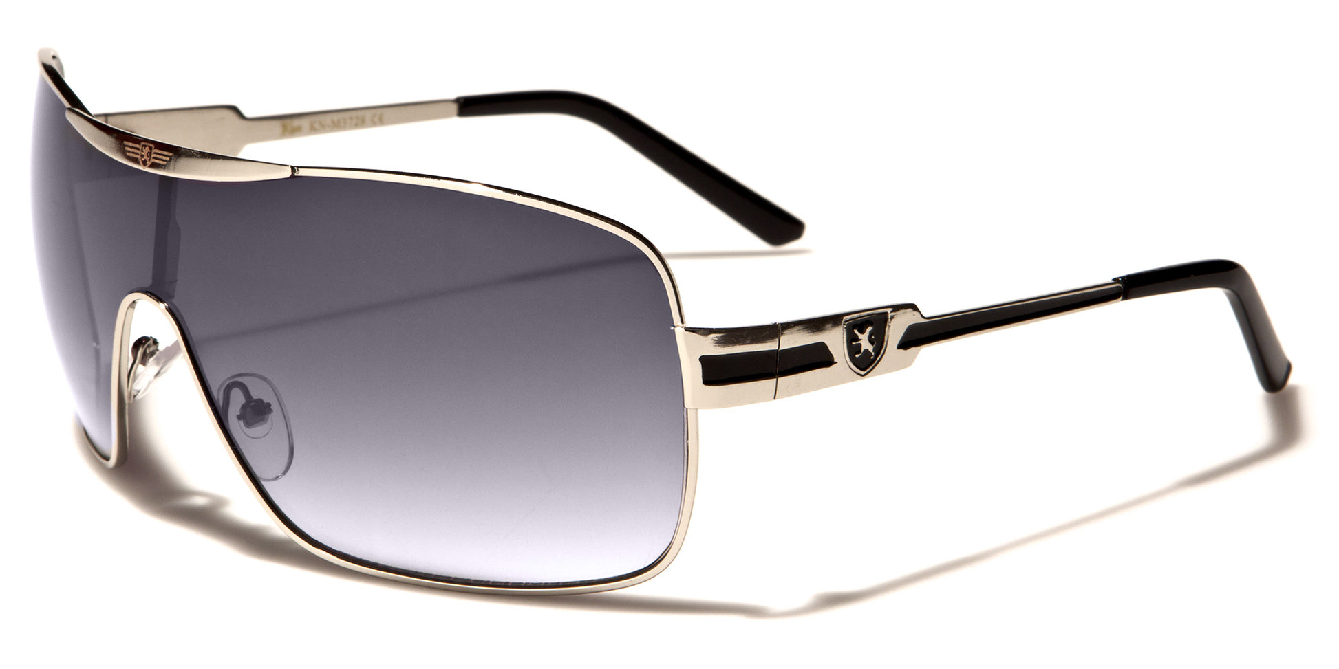 Oversized aviator sunglasses with a cool shield lens, these fancy shades by Khan are made for men who want to stand out in a crowd. The frame is all metal, flexible and lightweight, able to stand up to tough use. The arms start thick with a Khan logo on the side, then drop down and stay straight to the curved plastic coating at the ear. The lenses feature a dark finish and are designed to protect your eyes from the sun and offer you privacy.