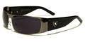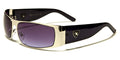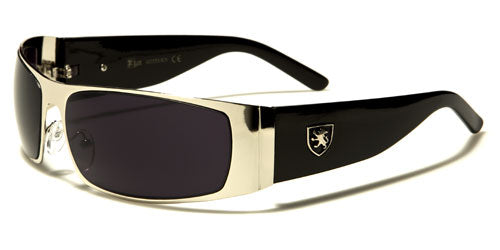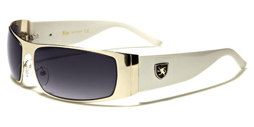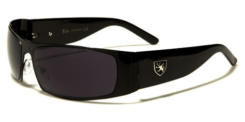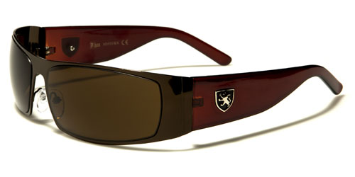 Keep in style with this gorgeous pair that is designed for an active lifestyle. These Khan bulk sunglasses for men feature full, metal rims in the shield style, a molded bridge and a pair of transparent silicon nose pads that are adjustable for a customized fit. The frame ends in wide endpieces, to which wide plastic stems are attached. A metal logo of a shield with a rearing lion is attached to the arms. These sunglasses are made of quality lightweight metal and plastic. The frames come in black, gunmetal, silver and bronze, and the arms come in black, white and brown.