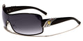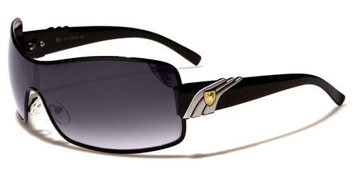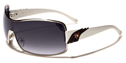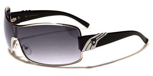 Stylish sunglasses with added flair, these cool shades for men are designed by Khan and are sure to grab attention and notice wherever you go. The arms show off the Khan logo against a wave-like design element that really pops. The arms are straight and thick with a taper and curve at the ear. The lenses are enclosed in the thin metal frame and are large and molded in the shield style. The gradient lenses offer great privacy and protection from the sun.