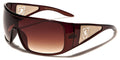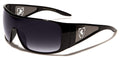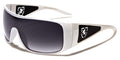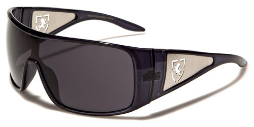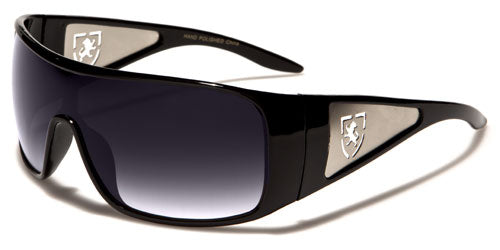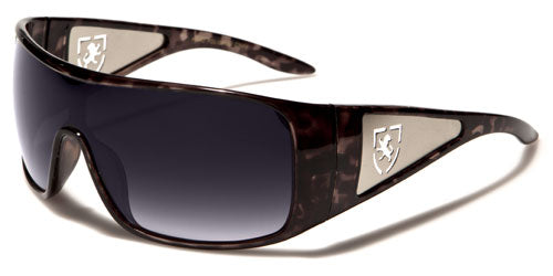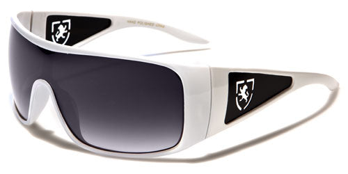 Khan has created a futuristic pair of men's sunglasses that have a rounded, sweeping look. The lenses fit nicely in the overall shape with their shield style construction. The finish on the lenses is dark and will protect your eyes and give you great privacy. The frame is all plastic, strong and rigid, but lightweight and comfortable to wear. The arms come straight of the face and taper sharply to the curved ear. The see-through Khan logo is seen boldly on the side on a metal panel.