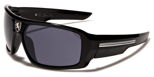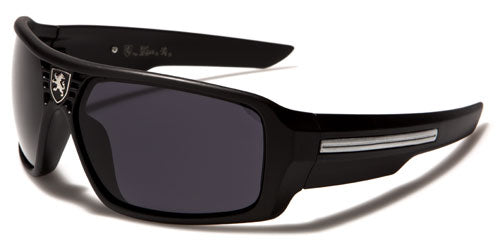 Bold and attractive, these sunglasses for men by Khan are large and square and will make you feel cool whenever you wear them. The frame is all plastic, lightweight and easy to wear, but still strong and durable to hold up to everyday use. The arms start thick from the face and step down to flow straight back to the ear. The side features a cool design pattern, and the Khan logo is shown front and center on the frame. The lenses are rectangular with smooth edges and a dark finish to protect your eyes.