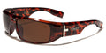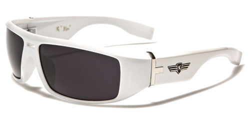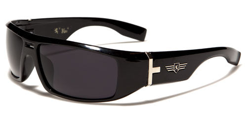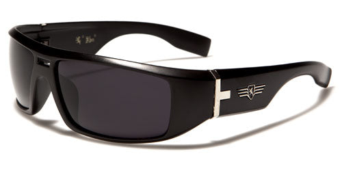 Contoured to fit your head and still look cool and stylish, these sunglasses by Khan are designed for men who want to sport their own unique attitude. The frame is solid plastic, thick and tough looking. The arms start straight off the face and taper sharply around a curve to the ear. The Khan logo is displayed in silver on the side next to a silver divider. The lenses are rectangular with smooth corners and with a dark finish that hides your eyes and blocks the sun.