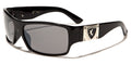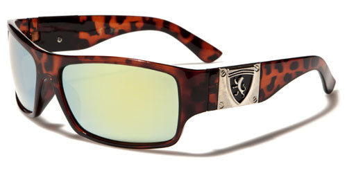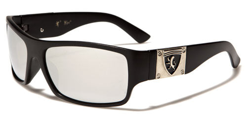 Throwback sunglasses for men who have a unique style, Khan designed these shades to grab attention and bring out your best attributes. The frame is all plastic, made to be strong and rigid, but flexible enough to fit comfortably and withstand everyday use. The arms are thick with a sweeping taper toward the ear. The Khan logo is boldly displayed inside a silver box with rivets on the corners. The lenses are rectangular with a finish that blocks ultraviolet rays.
