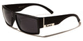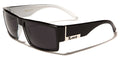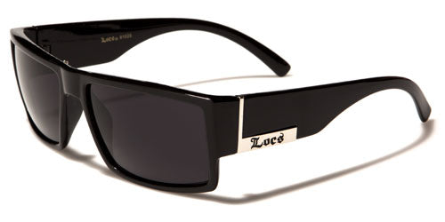 Locs has designed a cool pair of sunglasses for men who like to show off their own unique attitude and style. The frames are made of thick plastic, designed for strength and to make a statement. The arms start thick after a silver vertical divider at the temples and taper smoothly with a swooping curve around the ear. The Locs logo is featured on the side in black letters on a field of silver. The lenses are rectangular and are dark, offering excellent protection from the sun and maximum privacy.