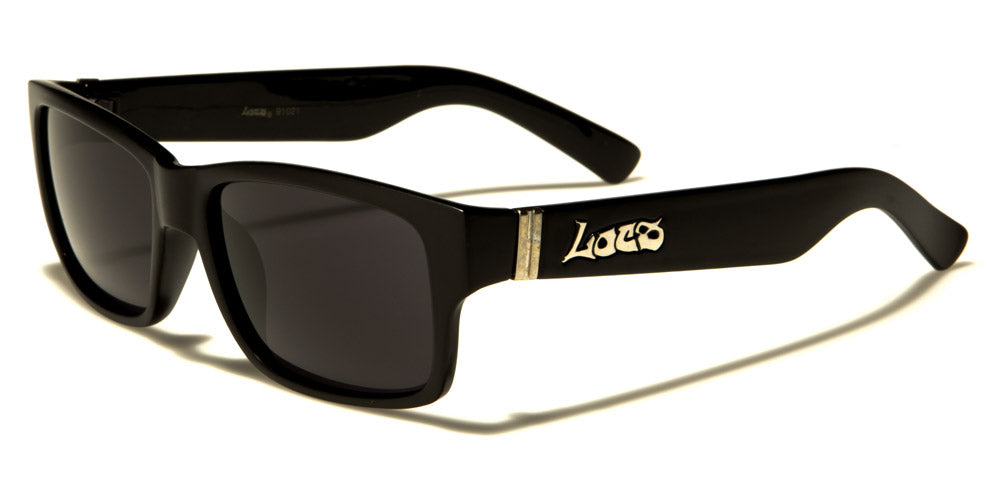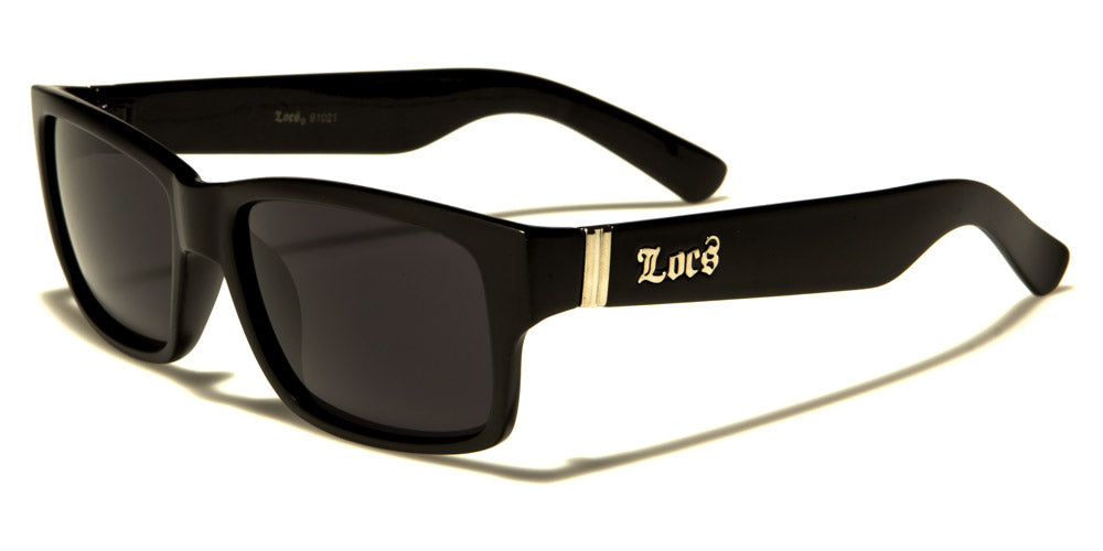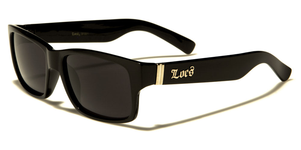 These stylish shades by Locs are designed for men and have a retro quality that demands notice. The frame is made of strong black plastic, designed for strength but also comfort. The arms feature the Locs logo in flowing silver script next to a vertical silver divider at the temples. The arms flare and taper at the curve around the ear. The lenses are squared off and dark for protection and privacy. These cool shades are available with different versions of logos for your unique taste.