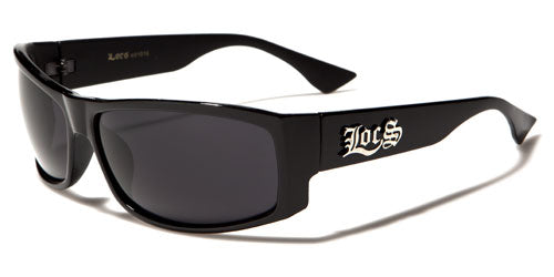 Check out these square and boxy gangsta shades for men by Locs, made to draw attention and with a completely black look that stands out in a crowd. The frame is made of plastic, molded to fit comfortably but also strong and durable. The arms start straight and then taper sharply through a curve at the ear. The Locs logo is seen displayed proudly on the arms in raised silver letters. The lenses are dark with a low profile, and they offer solid ultraviolet protection.