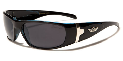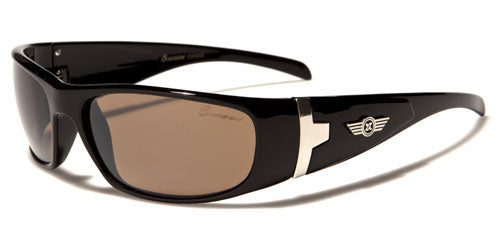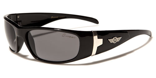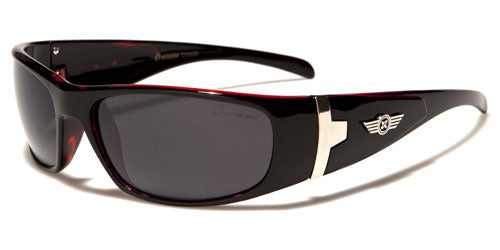 Sleek and stylish, these sunglasses for men by Oxigen are tight looking and tight fitting. The frame is made of plastic, thick and durable, but also molded to fit comfortably and lightly on your head. The arms come straight off the face and taper through a gentle curve to the earpieces. The Oxigen logo is seen on the side next to a vertical silver divider. The lenses are small and dark, offering privacy and protection from the sun. Buy in bulk for excellent savings.