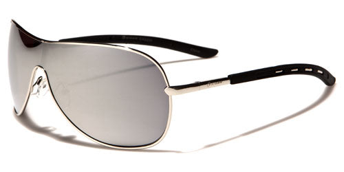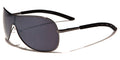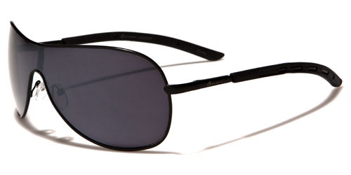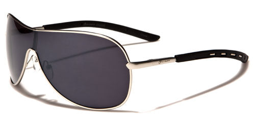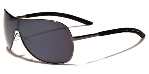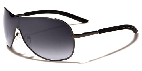 These aviator-style sunglasses for men are made by Oxigen and are designed to protect your eyes and keep you looking good at the same time. The frame is metal with a thin rim around the lenses, and the thin arms are plastic and curve around the ear. The lenses are dark, flow together in the middle in the shield style and offer maximum protection for your eyes from harmful ultraviolet rays. Purchase these shades in bulk at 12 pieces per box for great savings.