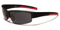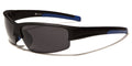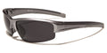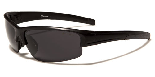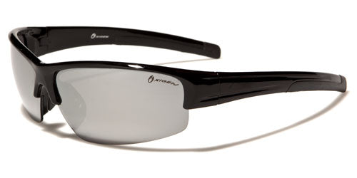 These cool shades by Oxigen are made for men in a semi-rimless style that lets you be active and not worry about your eyes or keeping your sunglasses on. The frame is made of plastic, designed to be rigid and withstand rough and constant use. The arms are thick and textured, and they come off the top of the frame and stay straight back to the ear. The lenses are dark and have an added nosepiece in the middle for better grip. The Oxigen logo is seen in the top corner of the left lens.