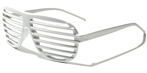 These novelty shutter shades in white are for men and women who want to stand out in a crowd and have a little fun with what they wear. They are made in the aviator style, but are anything but aviator shades. The frame is made of plastic with a lightweight feel and a durable construction. The arms are straight and thin with a bend at the ear. The lens area features a slatted look that hides your eyes and breaks up the glare. Buy a bunch for your next party and save with bulk pricing.