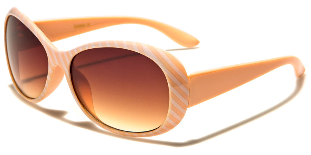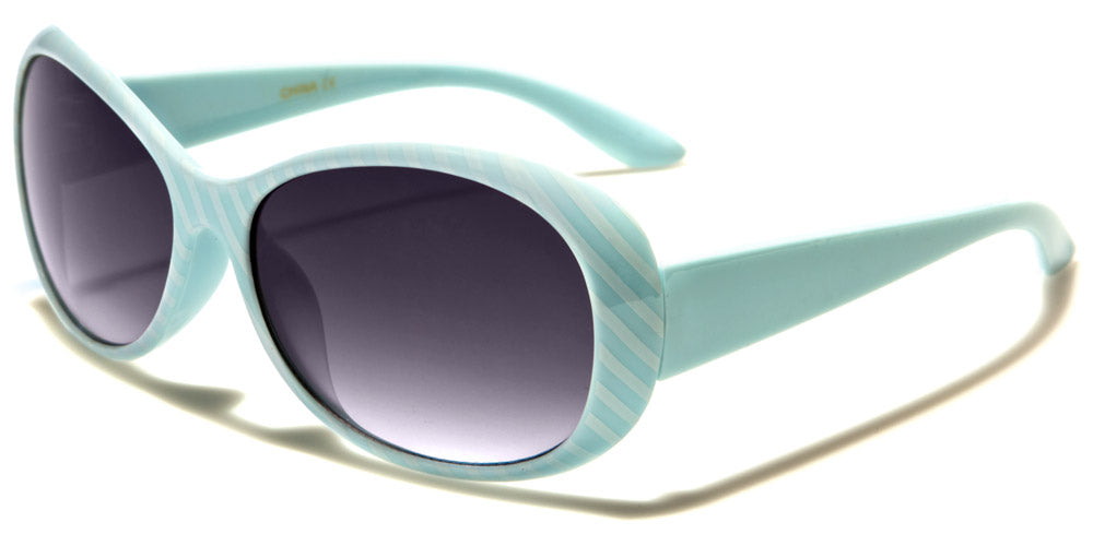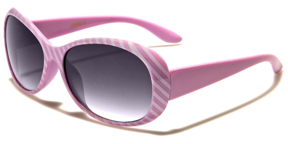 What little girl wouldn't adore the scrumptious sherbet colors and movie star shape of these oval sunnies? Plastic frames widen at the outside edges. Medium-wide arms attach halfway down the frames to lift the lenses so that they cover the entire eye area. Arms narrow into curved earpieces. Choose from all-black frames and black arms with black lenses; candy-striped white and salmon frames with salmon arms and black lenses; candy-striped white and orangesicle frames with orangesicle arms and amber lenses; candy-striped white and lemon frames with lemon arms and black lenses; candy-striped white and aqua frames with aqua arms and black lenses; or candy-striped blackcurrant purple frames and blackcurrant purple arms with black lenses. These sunglasses are sold in bulk by the dozen.