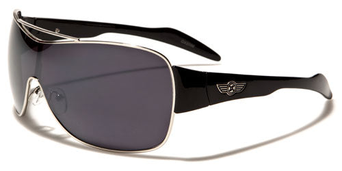 Shield sunglasses are designed primarily to protect your eyes, and these great shades for men and women by Oxigen do that and a whole lot more. These sunglasses will definitely make you stand out in a crowd, with a dark frame and finish you will appear mysterious. The frame is plastic in areas for rigidity and metal in other areas for flexibility and fit. The arms start straight and taper sharply then flair at the ear. The lenses are large with a dark finish and feature adjustable nosepieces for better grip.