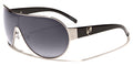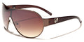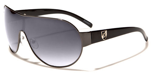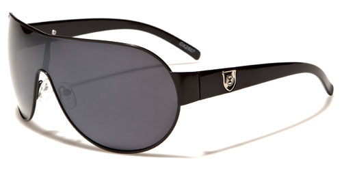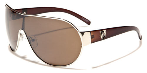 Aviator sunglasses with a cool shield lens, these shades by Oxigen are made for men who want functionality, but don't want to wear a staid or standard-looking pair of glasses. The frame is metal with a thin rim around the lenses and flexibility throughout. The plastic arms are straight off the temples and a slight curved taper at the ear. The arms sport the Oxigen logo on the side. The lenses are large and meld together in the middle with a dark, protective finish.