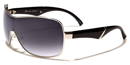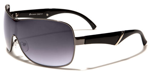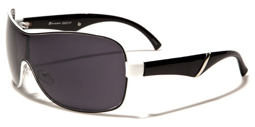 Large and dark, the lenses on these shield sunglasses for women and men by Oxigen are specifically made to protect your eyes from the sun, dust and other debris. The glasses are made of a combination of metal and plastic, built to last and to stand up to the variety of everyday use. The arms have a sweeping shape as they flow down and back to the curved earpiece. These great shades are available in many different frame and lens color options, so choose what best fits your attitude.