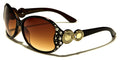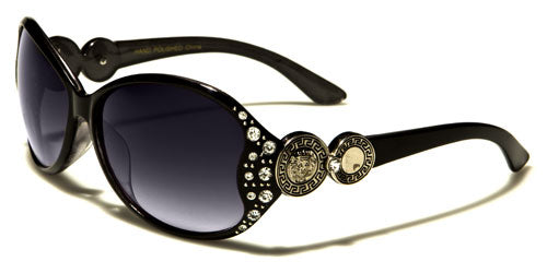 These plastic rhinestone metal-logo Kleo women's sunglasses have a look that's much different from what you would find with any other pair of shades. There are small gems on the outside of the frames. The frames around the lenses are large, but the earpieces are much smaller. These sunglasses have small, shiny circular pieces on the arms that increase the strength of the sunglasses themselves. Although the style of the sunglasses is unique, you will find that it's much easier to match them with other parts of your wardrobe.
