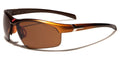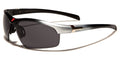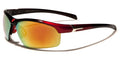 Sports glasses with a semi-rimless lens, these shades for men by Khan will protect your eyes during outdoor activities. The frame is all plastic, made to flex and bend as needed, but rigid enough to hold its shape and stay on your head. The arms are straight with a cool color pattern on the side and a metal T-shaped section. The Khan logo is seen in red and black in the middle of the frame between the lenses. The lenses are dark and include a rubberized nosepiece.