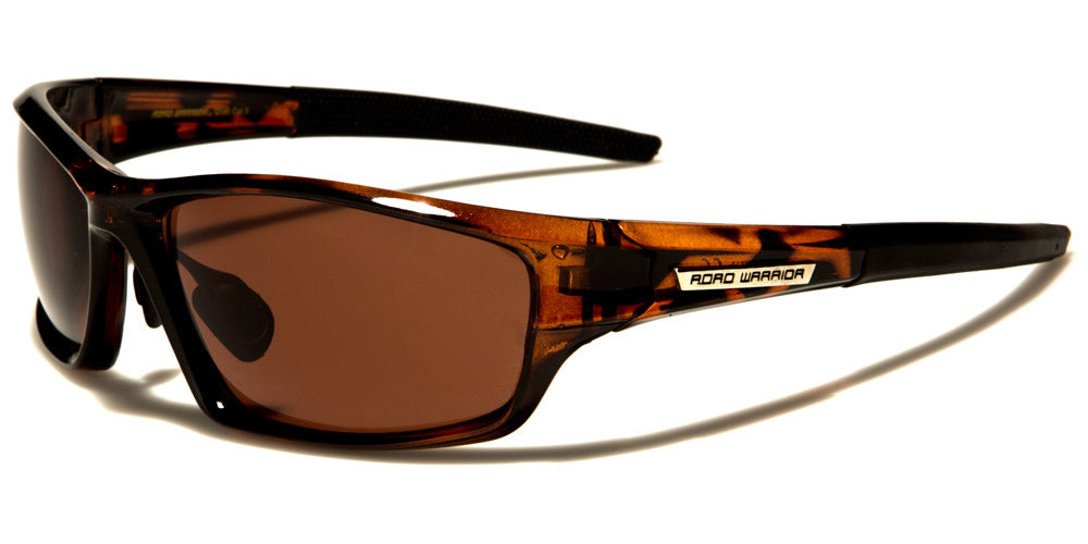 Conquer the roads with these Road Warrior oval sunglasses for men. These shades feature a pair of rubberized and ridged nose pads, oval lenses and a metallic strip bearing the Road Warrior brand name on the arms. The frame comes in glossy, matte black, silver and tortoiseshell brown. The temples end in rubberized black tips. The lenses are designed specifically for drivers, with their high-definition UV400 protective brown lenses. The glasses are sold in boxes of 12.
