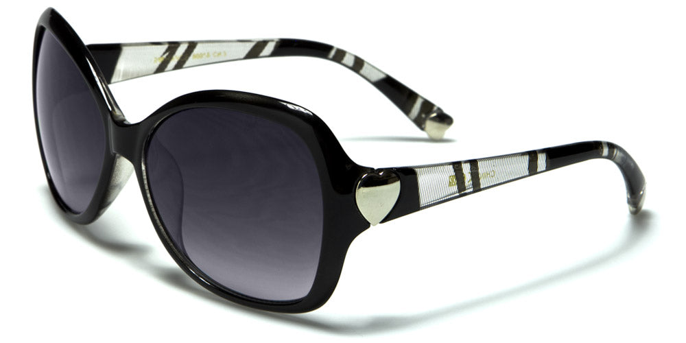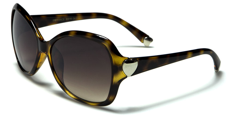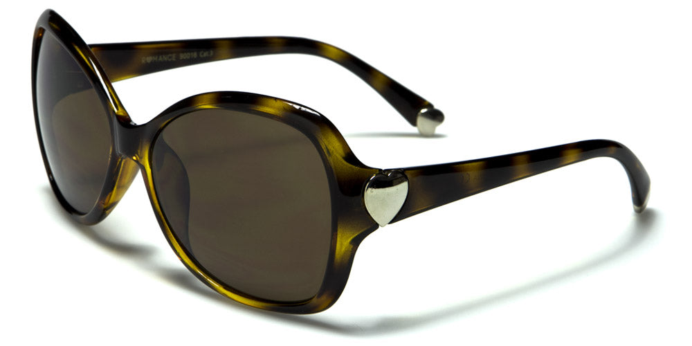 These Romance bulk sunglasses are specifically designed to accommodate women's smaller facial shapes and bone structure. Featuring oval butterfly-style lenses, these sunglasses feature the Romance heart on the temples and at the end of the earpieces. Made of molded plastic, these sunglasses come in both solid and animal-print colors, including black, silver snake print, brown animal stripe and two shades of brown tortoise. Versatile and upscale, this popular and trendy sunglass model is sought by teens and adults alike. Retailers will enjoy the profitable benefits of carrying this versatile brand, model and style that appeals to a wide age group.
