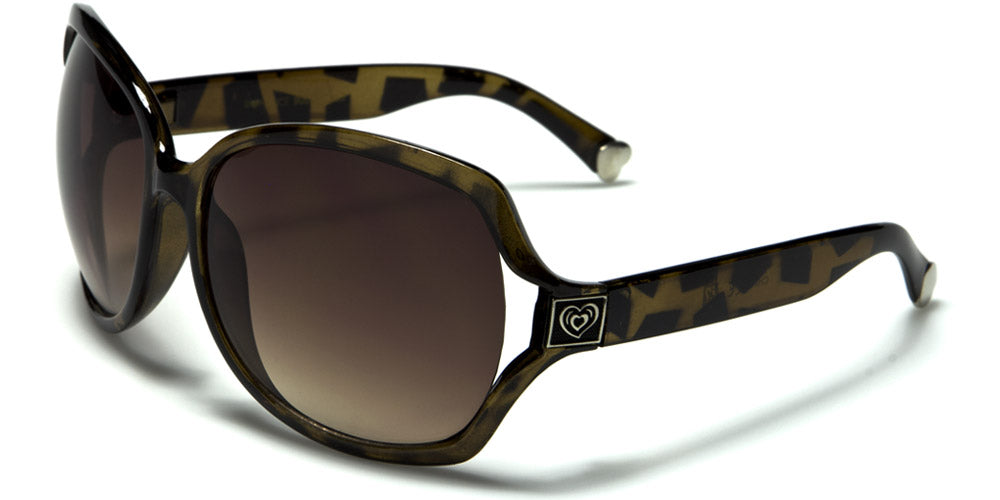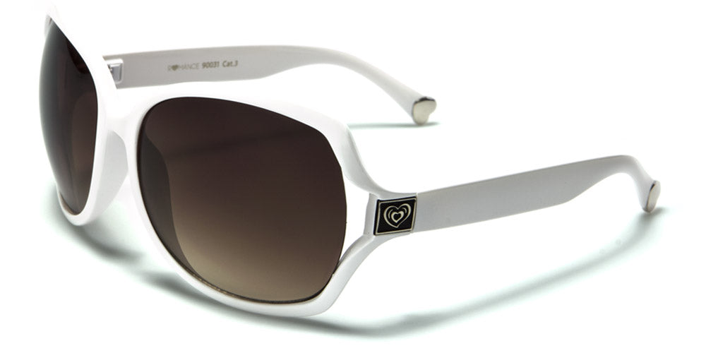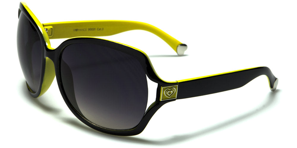 These Romance wholesale sunglasses are outfitted with big personality and even bigger style. These charming sunglasses feature the vintage oval butterfly lens that is elegant and charming. Adding a sense of feminine beauty to these sunglasses, the Romance heart is easy to see on the temple of these plastic contemporary frames. These sunglasses can easily be dressed up or down for a boho-chic or upscale appearance. Available colors include black, brown tortoise, black on pink, black on blue, black on yellow and the modern white. These sunglasses are an excellent addition to stores that feature women's accessories.