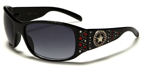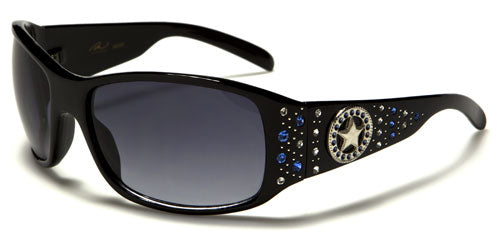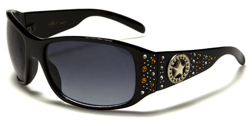 Romance is famous for making women's sunglasses that stand out and make you feel stylish and beautiful. These sweet shades are no exception, and the bling along will draw eyes and get you noticed. The frame is all plastic, molded to fit comfortably and strong enough to hold up to daily use. The arms start thick, then taper to a curve and sport many rhinestones and the Romance logo on the sides. The lenses are large and dark, protecting and hiding your eyes.