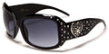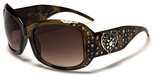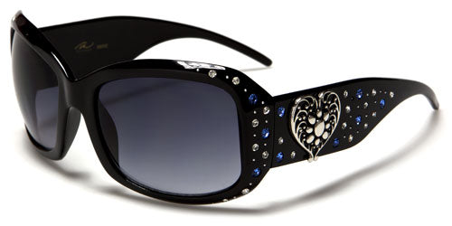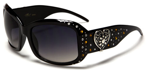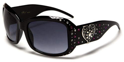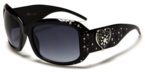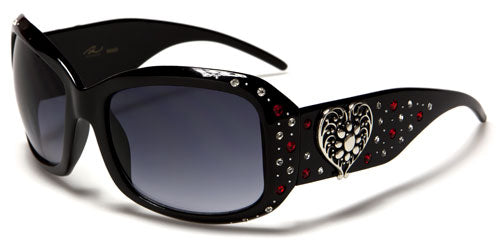 Show off your attitude and personal style with these studded out sunglasses for women by Romance. The frame is made of plastic and is covered with rhinestones that shimmer and shine and are sure to catch the eye of anyone around. The arms are thick with a heart icon on the side in silver. The gradient lenses are large and rounded with a dark finish that blocks out the sun and protects your privacy at the same time. Buy a bunch and save with bulk pricing.