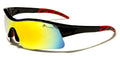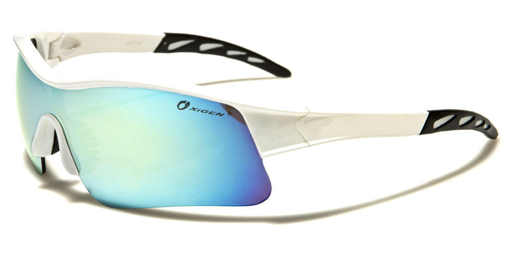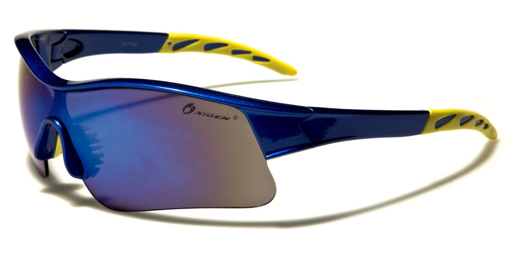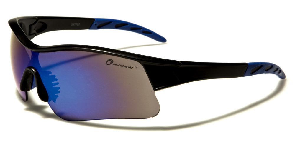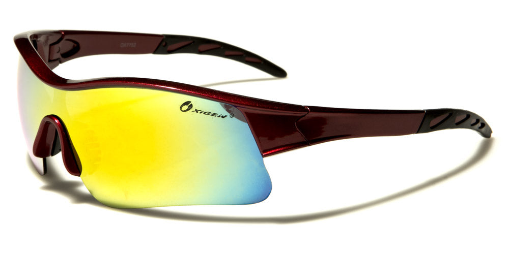 These sunglasses for men are designed by Oxigen and are shield shaped. They are designed for sports and active lifestyles and feature a wraparound fit and feel. The frames are made of a strong and durable plastic in a semi rimless design, anchoring the lenses from the top and leaving them free at the bottom. With a snug rubber nose piece and inward curving arm ends, these sunglasses will stay with you through the most challenging athletic endeavors.