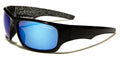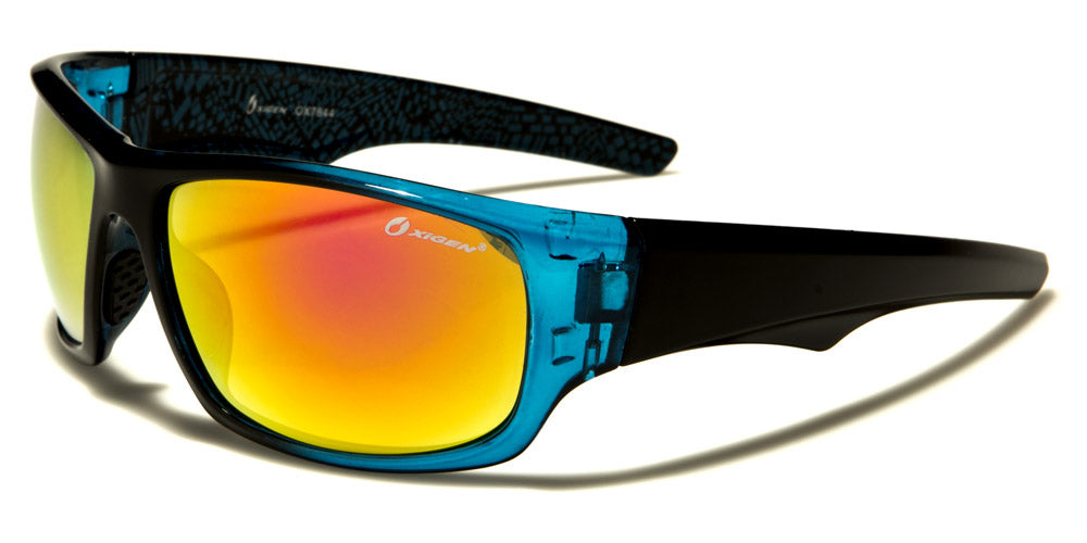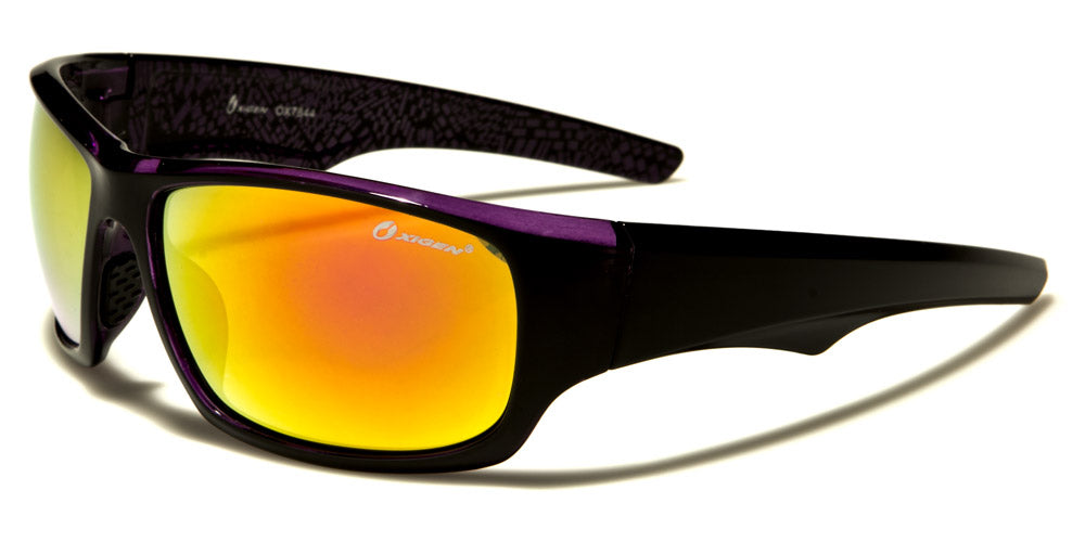 These sunglasses are designed by Oxigen for active men. The frame is thick plastic with a downward point in the middle of the arm. The arms are straight all the way back to the ears with a slight taper. The insides of the frame sport a unique patterned design. The lenses are oval in shape and match the overall sleek look and feel of the sunglasses. The lenses protect from ultraviolet rays, and the frames have a semi-translucent look that adds character and ensures privacy.