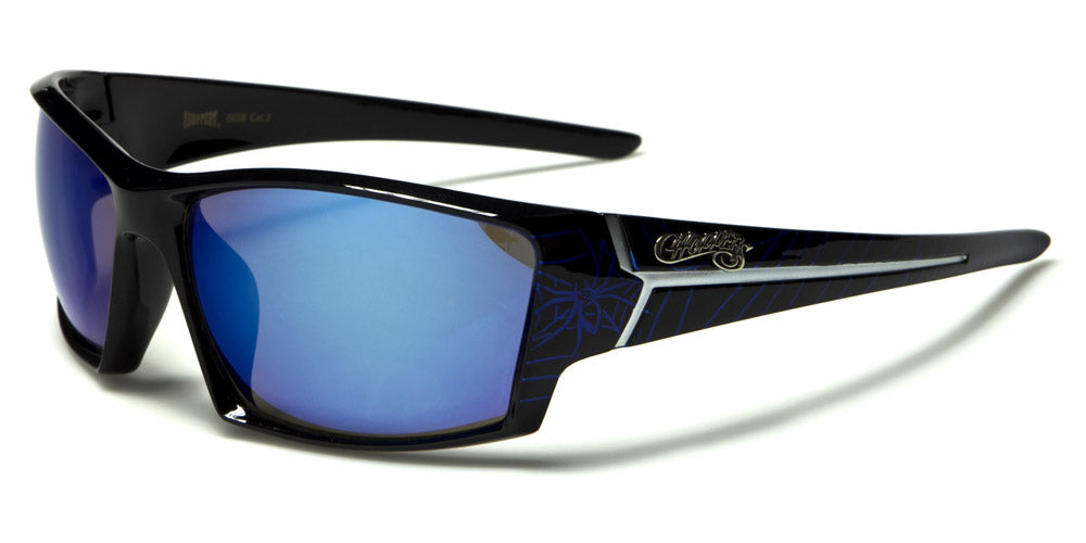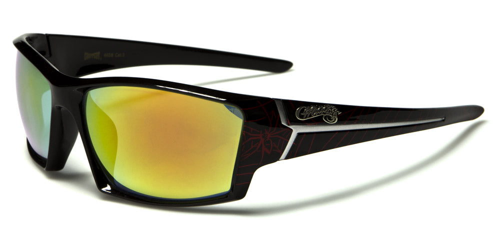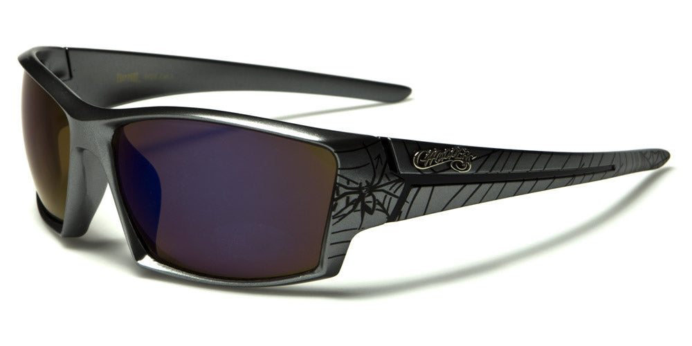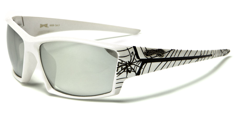 These sunglasses are designed for men in the chopper style and feature a spider-web pattern. The lenses are rectangular and provide ultraviolet protection on even the sunniest days. The glasses are made of strong plastic and carry the Chopper logo on the sides. These glasses are perfect for wearing on a motorcycle or bike, or for any outdoor activity. They will conform to your face and help keep the wind out while protecting your eyes from sun and debris.