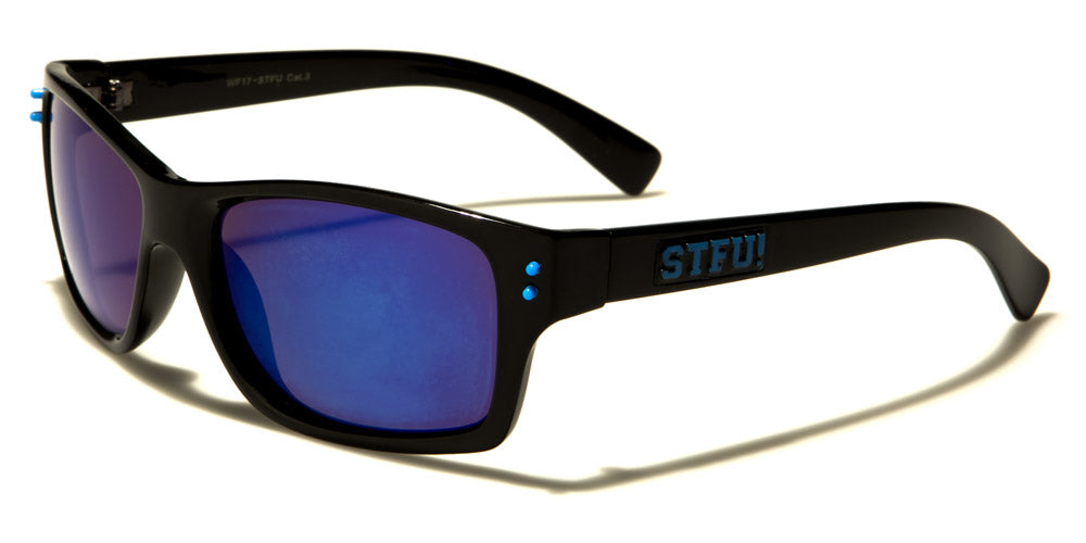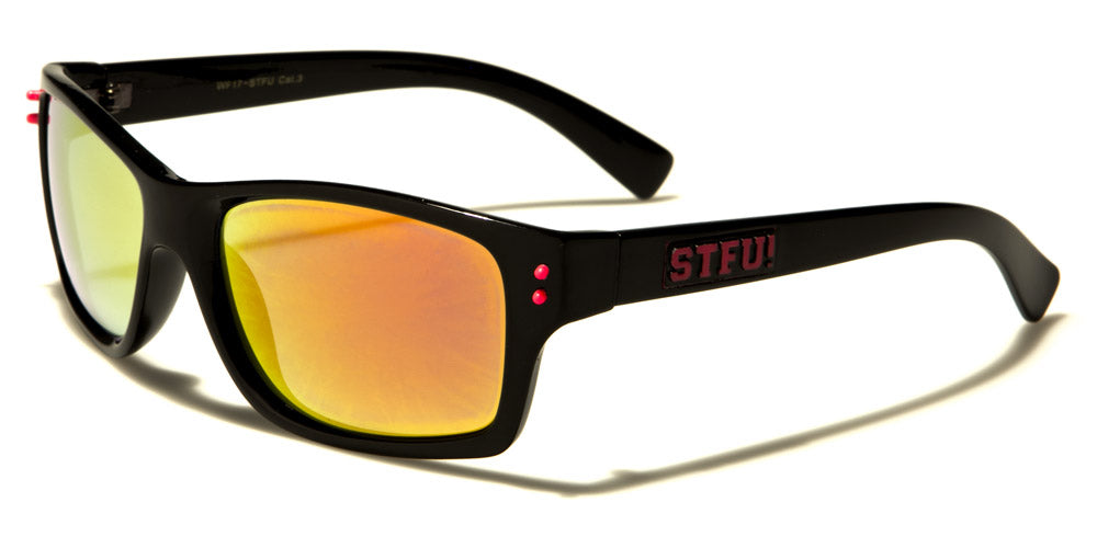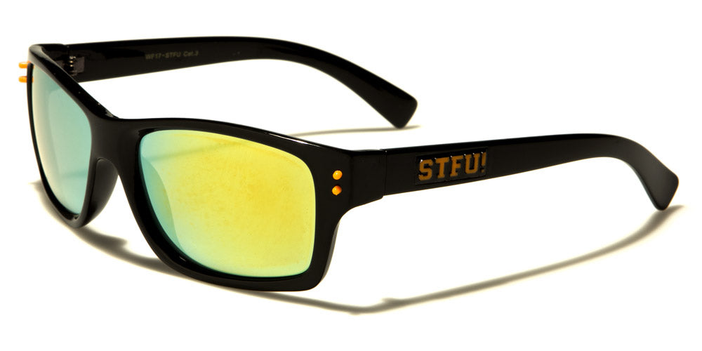 These classic bulk sunglasses are designed to appeal to both men and women. Featuring the distinct STFU! Logo on the arm, these trendy sunglasses come with black frame and an assortment of lenses, ranging from silver mirror, orange, yellow, green, purple and blue. These sunglasses are made of plastic, which makes them comfortable and lightweight. This design appeals to younger groups, which makes it perfect for retailers who sell collegiate or school supplies and accessories, young adult fashions or are simply trying to appeal to younger audiences. These bold designs are not for the faint of heart, which makes them appeal to teens and twenty-somethings.