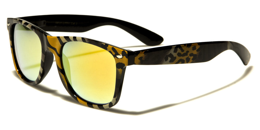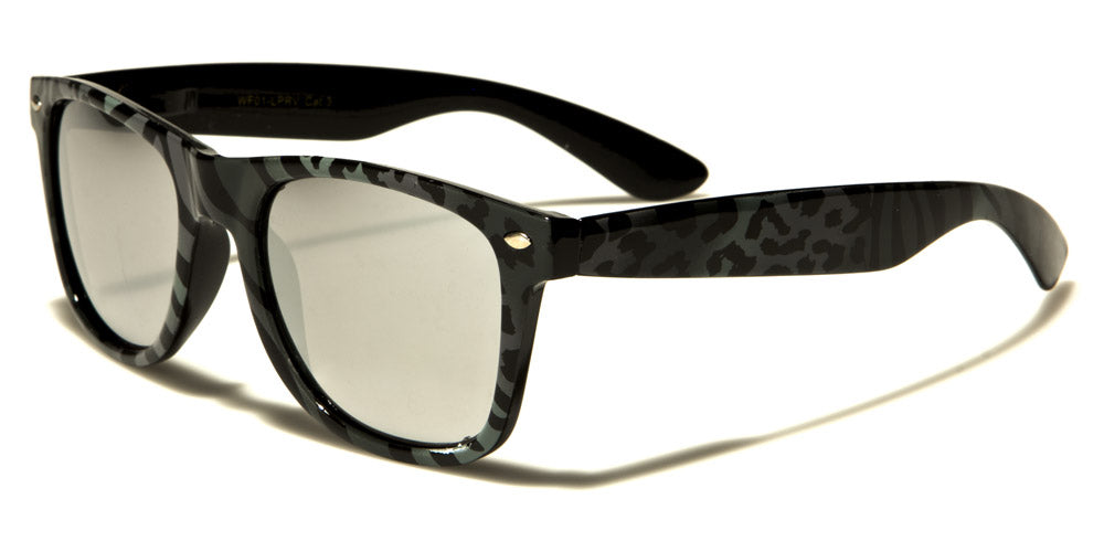 Animal-print sunglasses are always noticed, and these sweet shades for men and women come in a wide variety of colors and print styles that demand attention. The frame is made of plastic and is shaped in a retro classic style with a flat front and curved arms. The lenses are mirrored and come in a variety of colors, so choose the combination you love and wear them with confidence. The frames are finished in matte so they are subdued, but still sport their attitude.