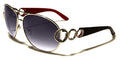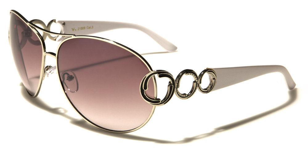 These VG women's aviator sunglasses feature are made of metal and plastic and highlight unique oval designs at the temples and arms. They offer UV400 tinting, which helps provide vital protection from dangerous ultraviolet rays, which are the leading cause of eye cancer. Arm colors include black, white, red, blue, beige and tortoise brown. These sunglasses offer adjustable earpieces and nosepieces for maximum comfort.