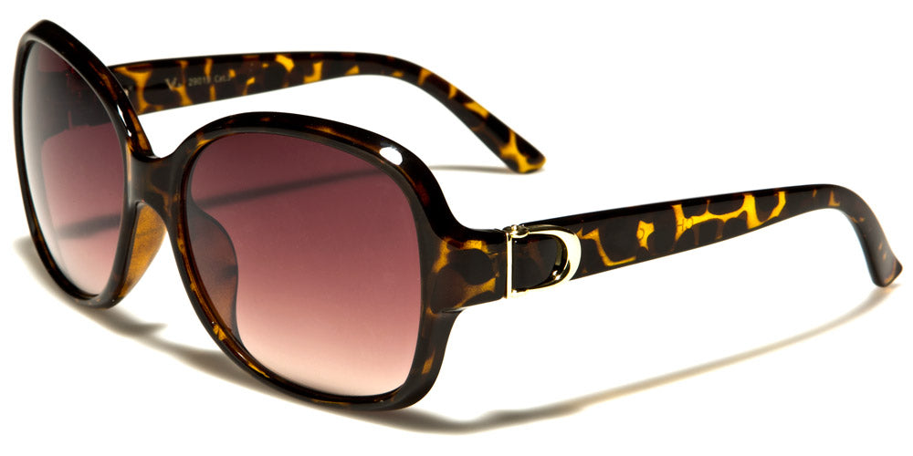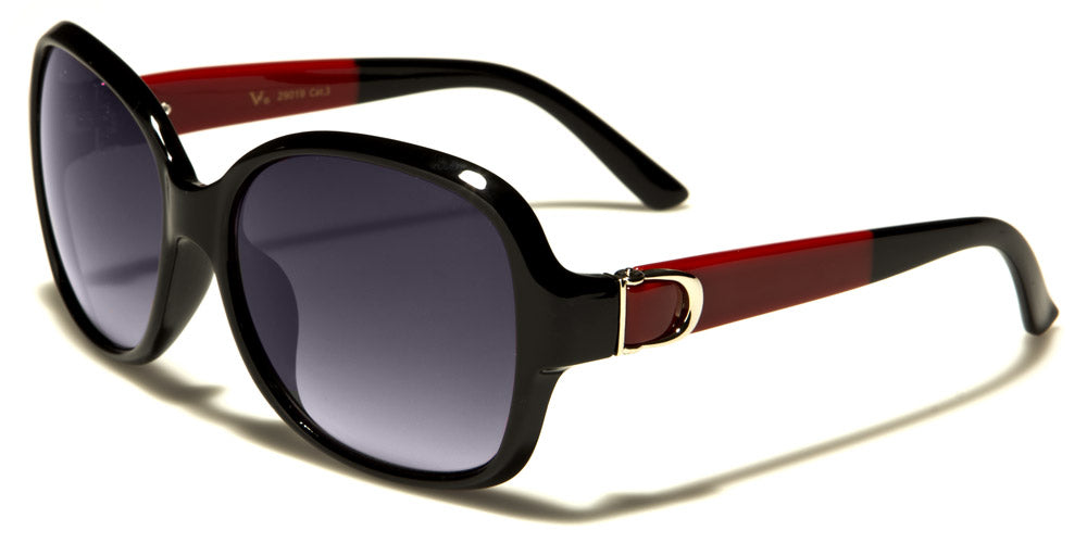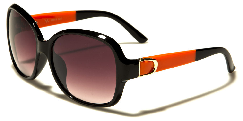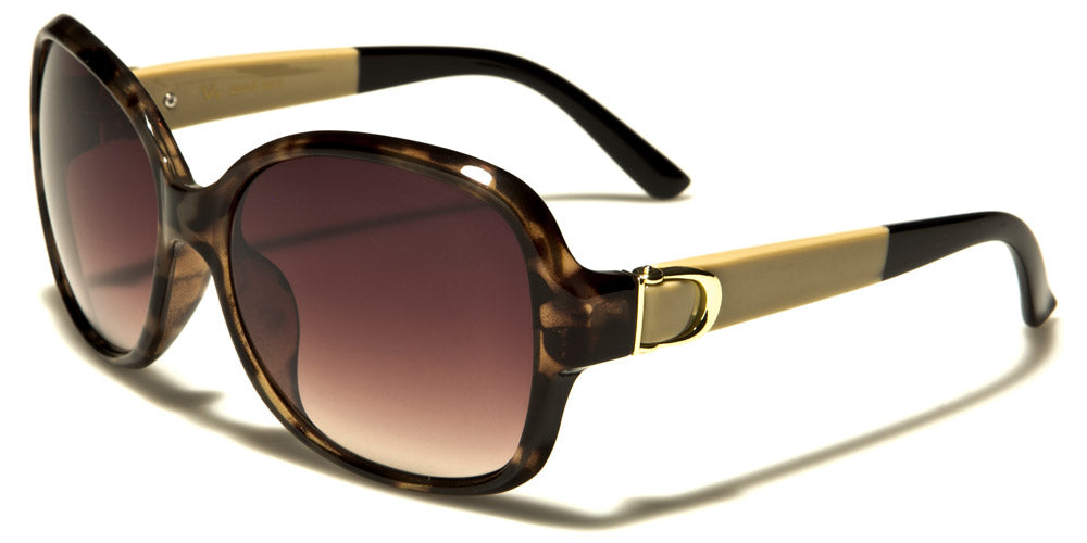 Butterfly sunglasses for women with a modern style, these attractive shades are made by VG and will definitely get you noticed. The frame is solid plastic, made for its strength and durability. The arms are straight with a two-tone finish and a silver stirrup at the front. The lenses are large and oval, with a dark finish that protects your eyes from ultraviolet rays and helps you keep your privacy. Choose from a variety of colors and patterns.