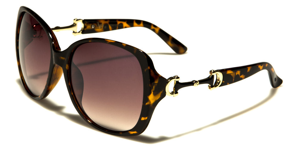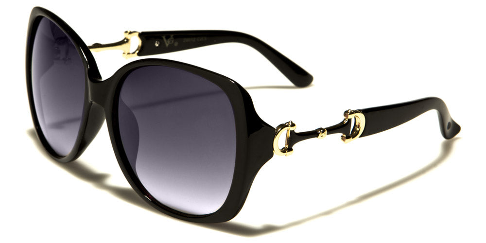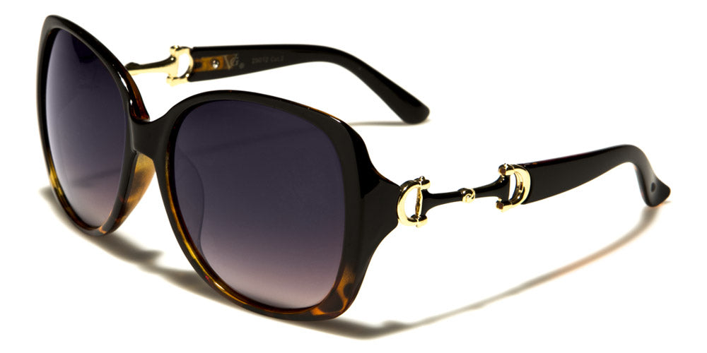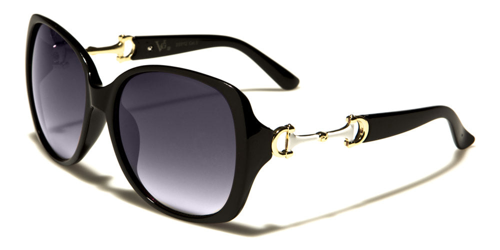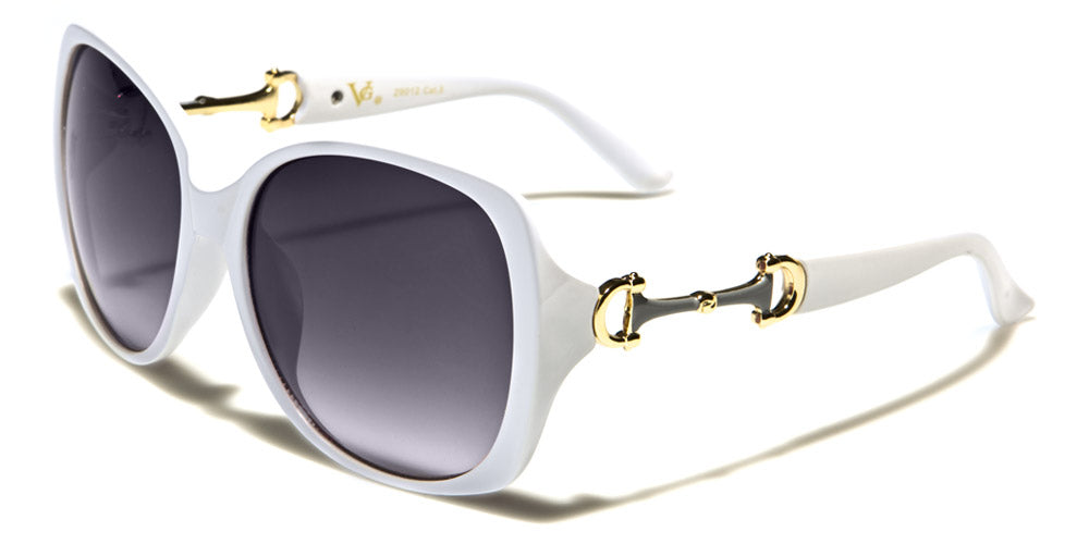 Look like a butterfly in these stylish sunglasses for women by VG designed to make you feel cool and mysterious. The frame is made of plastic that is strong, but lightweight, and formed to fit your face snugly. The arms feature a cool gold accented cut out piece and then stay straight to the curve at the ear. The lenses are large and dark, perfect to give you the privacy you want while drawing eyes everywhere you go. The shades come in several frame colors and patterns as well as different lens colors.