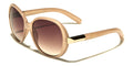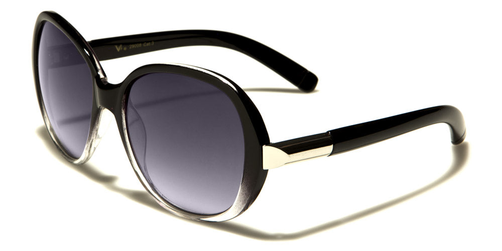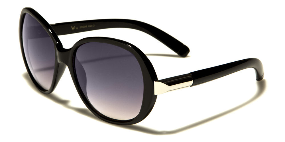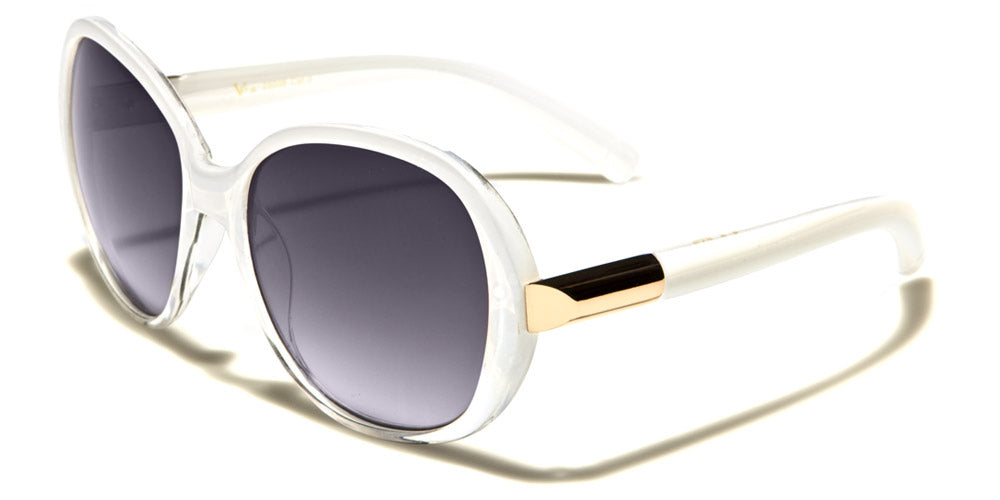 Smooth and round, these nice sunglasses for women are designed by VG and will show off your feminine side in a stylish way. The frame is made of strong plastic, and the sunglasses come in a variety of frame colors and print patterns. The arms are straight and rounded at the tips, with a silver section at the front and a gentle curve at the ear. The lenses are large and round, with a dark tint that protects your eyes from the sun and gives you privacy. Buy these shades in bulk for great savings.