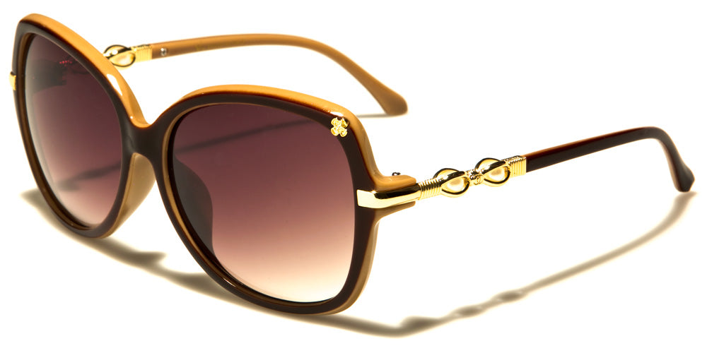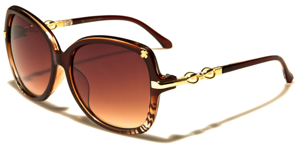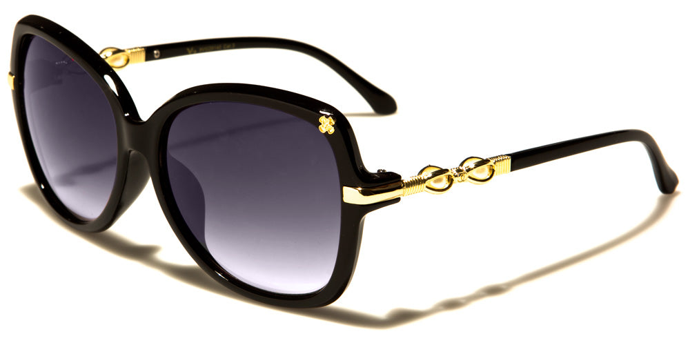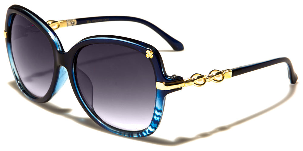 Large butterfly sunglasses ooze glam and beauty, and this pair from VG is no exception. Thick, plastic rims are highlighted by gold detailing and sparkly rhinestones. The temple arms offer unique, round cutouts near the hinges, and the top corner of the rims boasts a delicate design ornament. Boxes of these stunners include multiple frame-color variations, including black, blue, pink and two brown options.